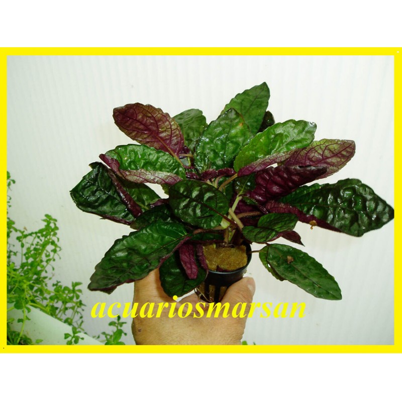 FORMA Y TAMAÑO: De altura puede alcanzar en acuario los 25-30cm, unos 15-20cm de ancho, cada hoja puede ser de larga de 6 a 10cm y de 1 a 3cm de anchura, suelen estar curvadas hacia abajo, estas hojas son dentadas y tienen un color peculiar, verde oliva en el haz y color purpura en el envés, pueden ser de forma alargada o con forma ovoide, dependiendo de su crecimiento (si este es sumergido o emergido).